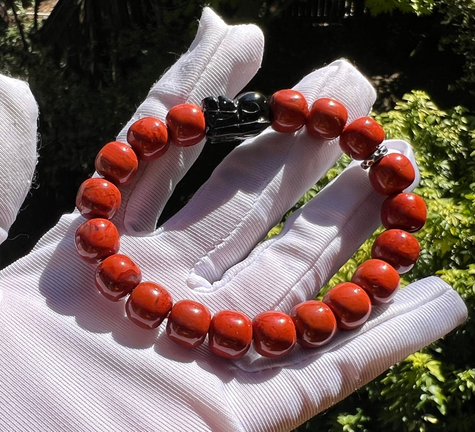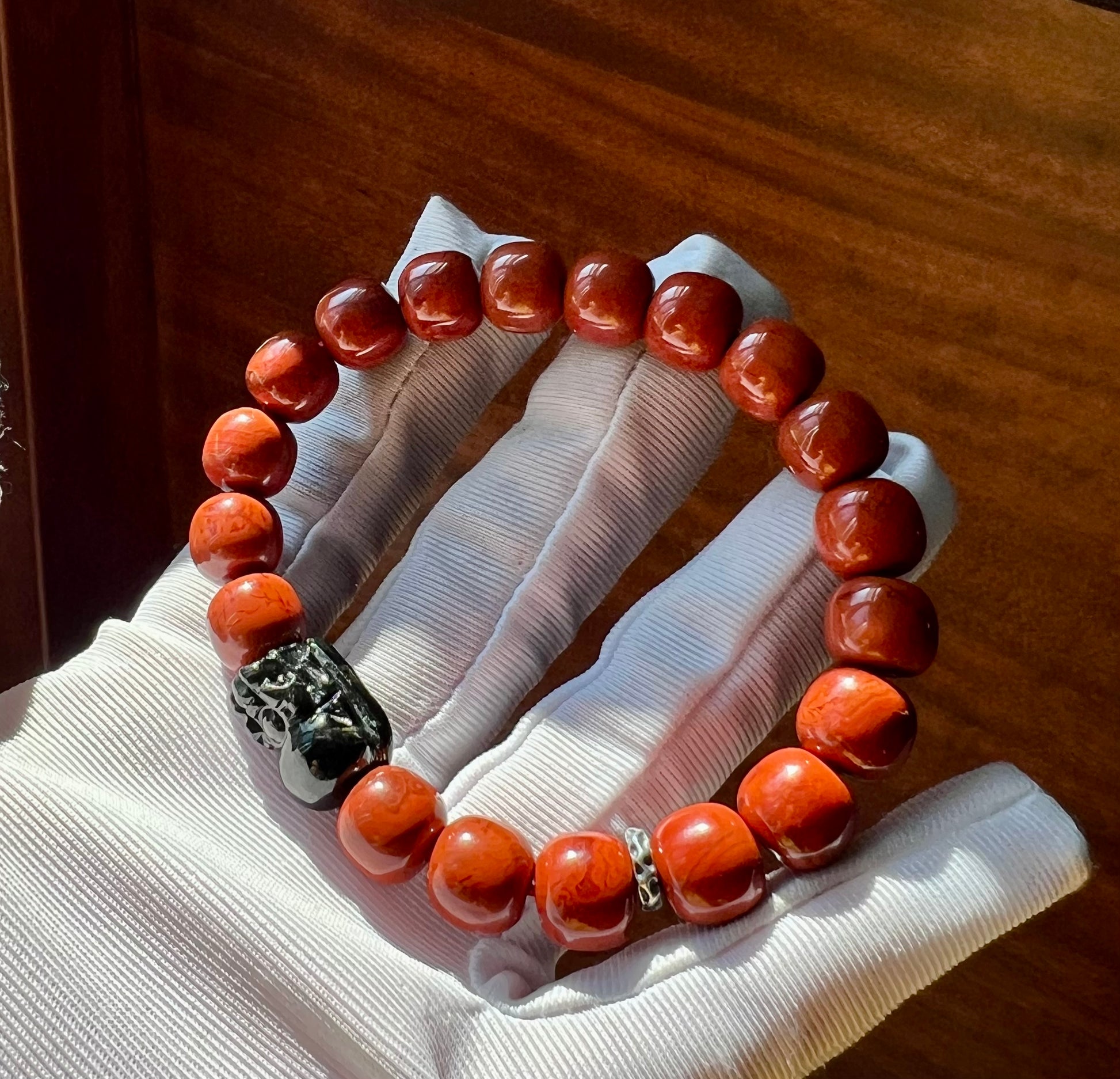 10*9mm Certified natural Nanhong Agate barrel Beads Bracelet, Southern Red Agate, with Hypersthene Pixiu charm, 全天然精品金运石貔貅 川料柿子红南红手串 满色满肉 #5947