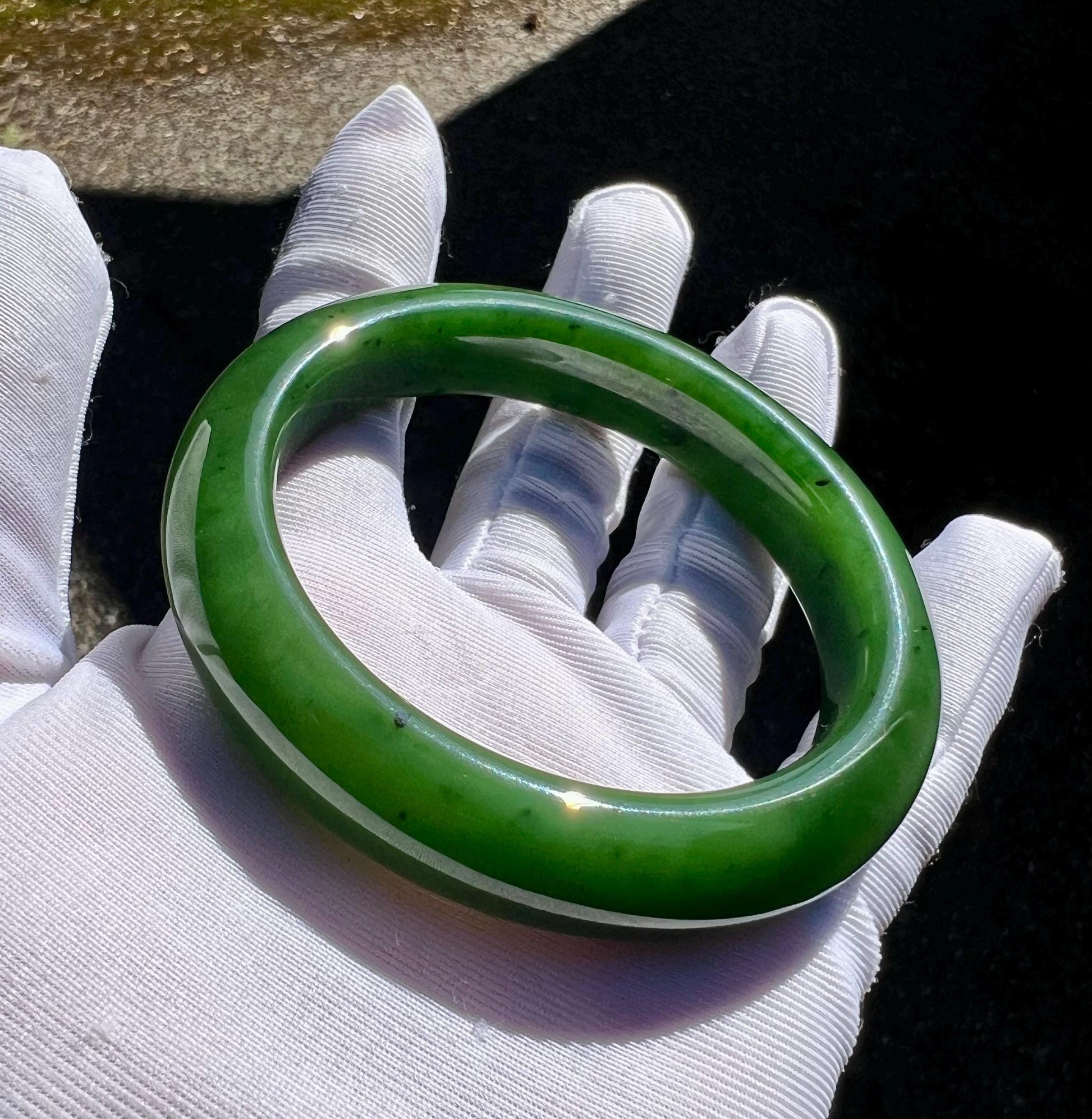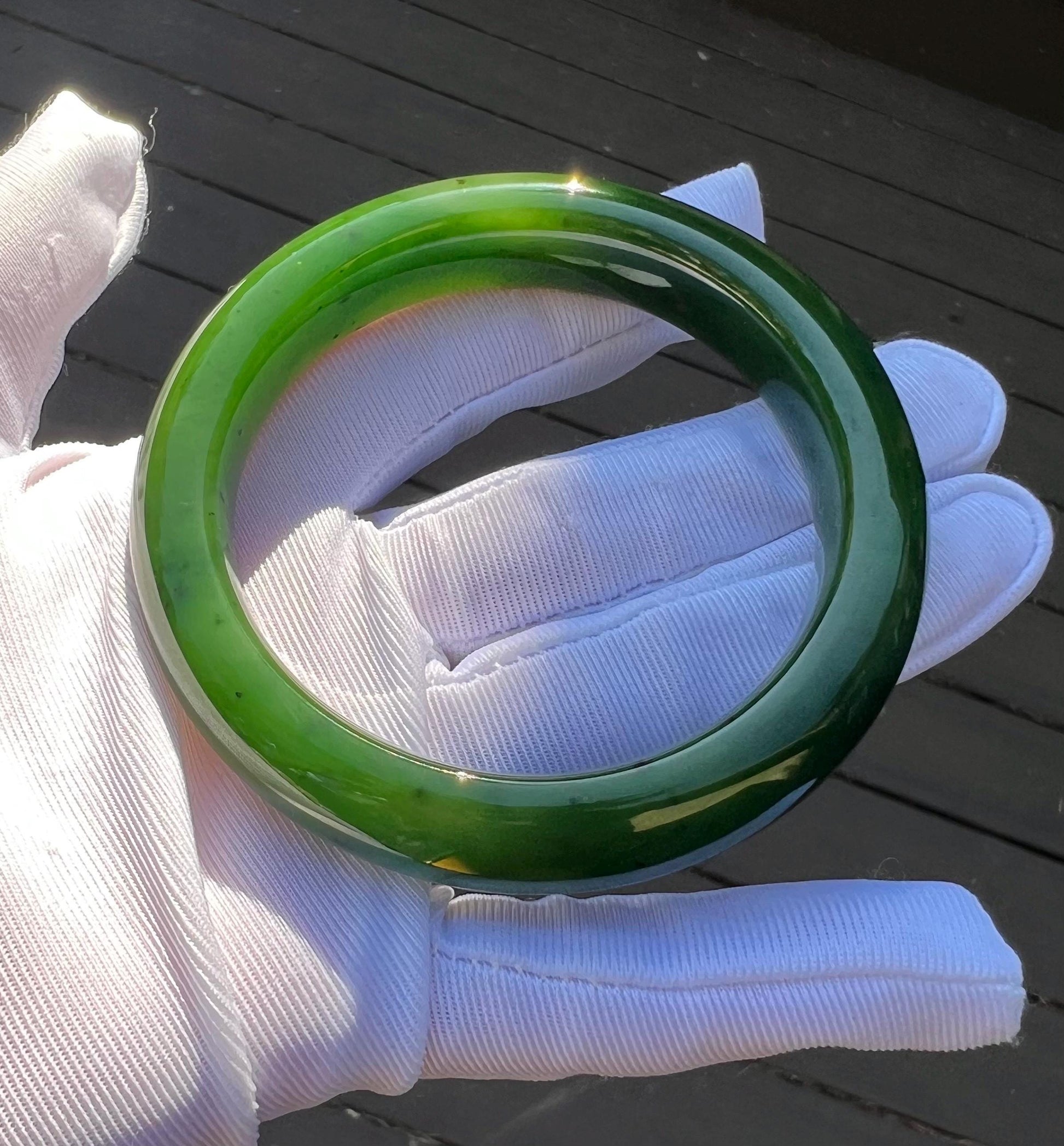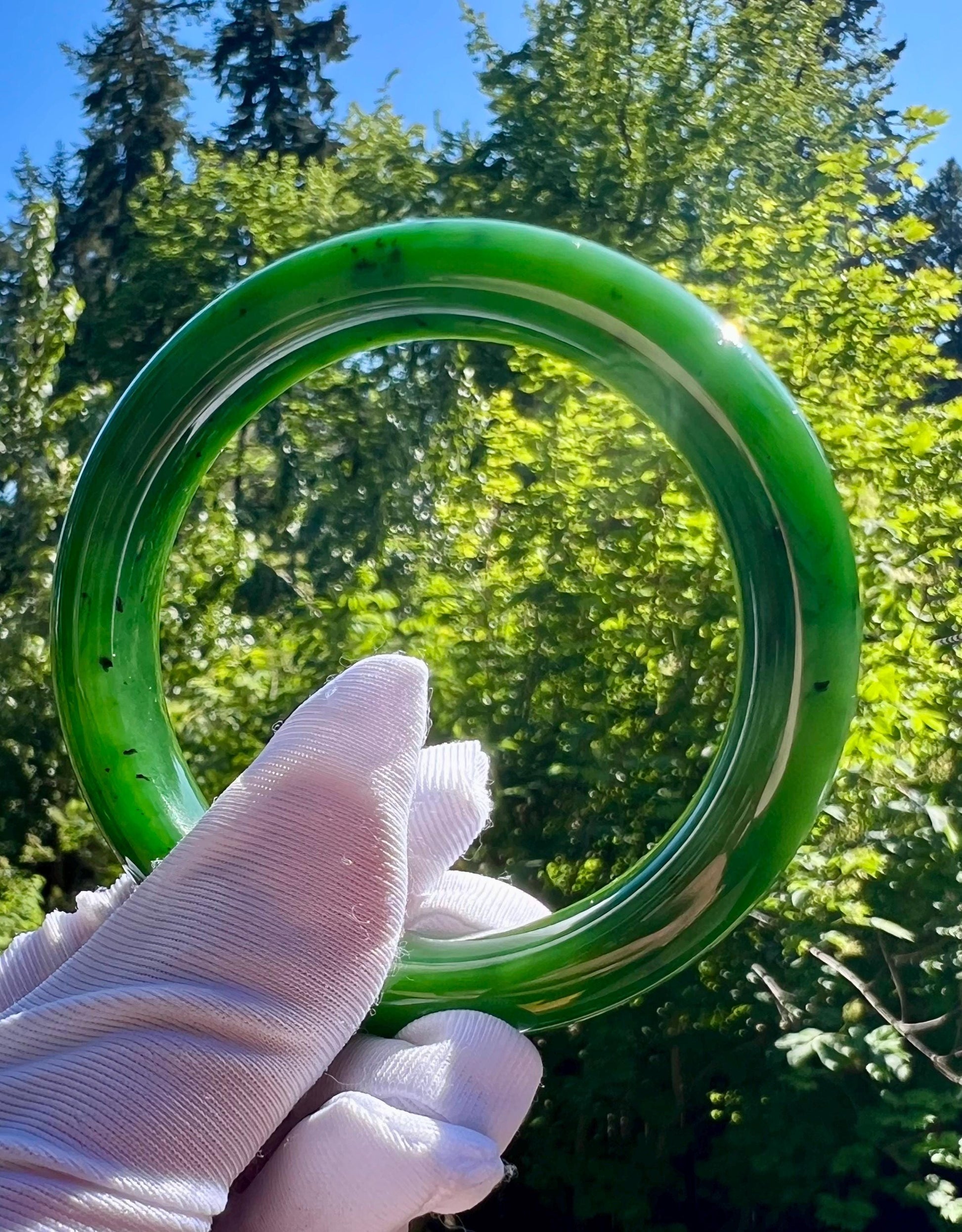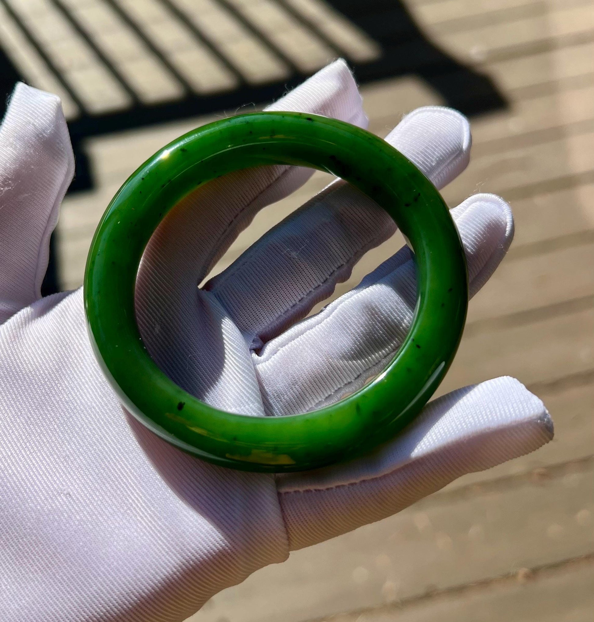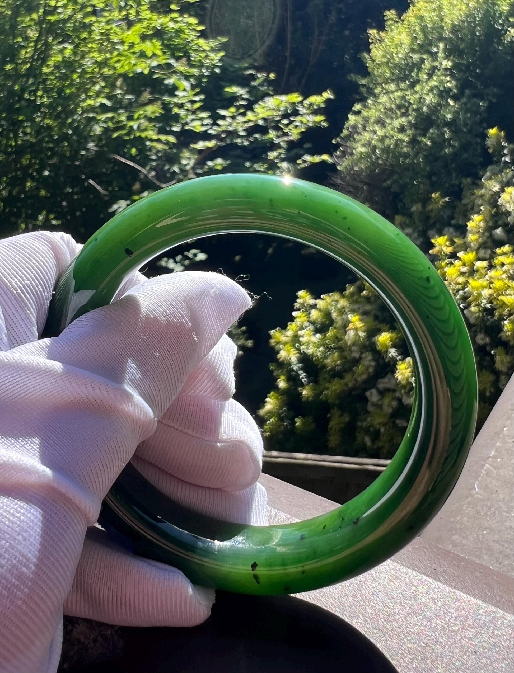 The bangle has mineral spots and natural nephrite structure. No impurities or cracks.