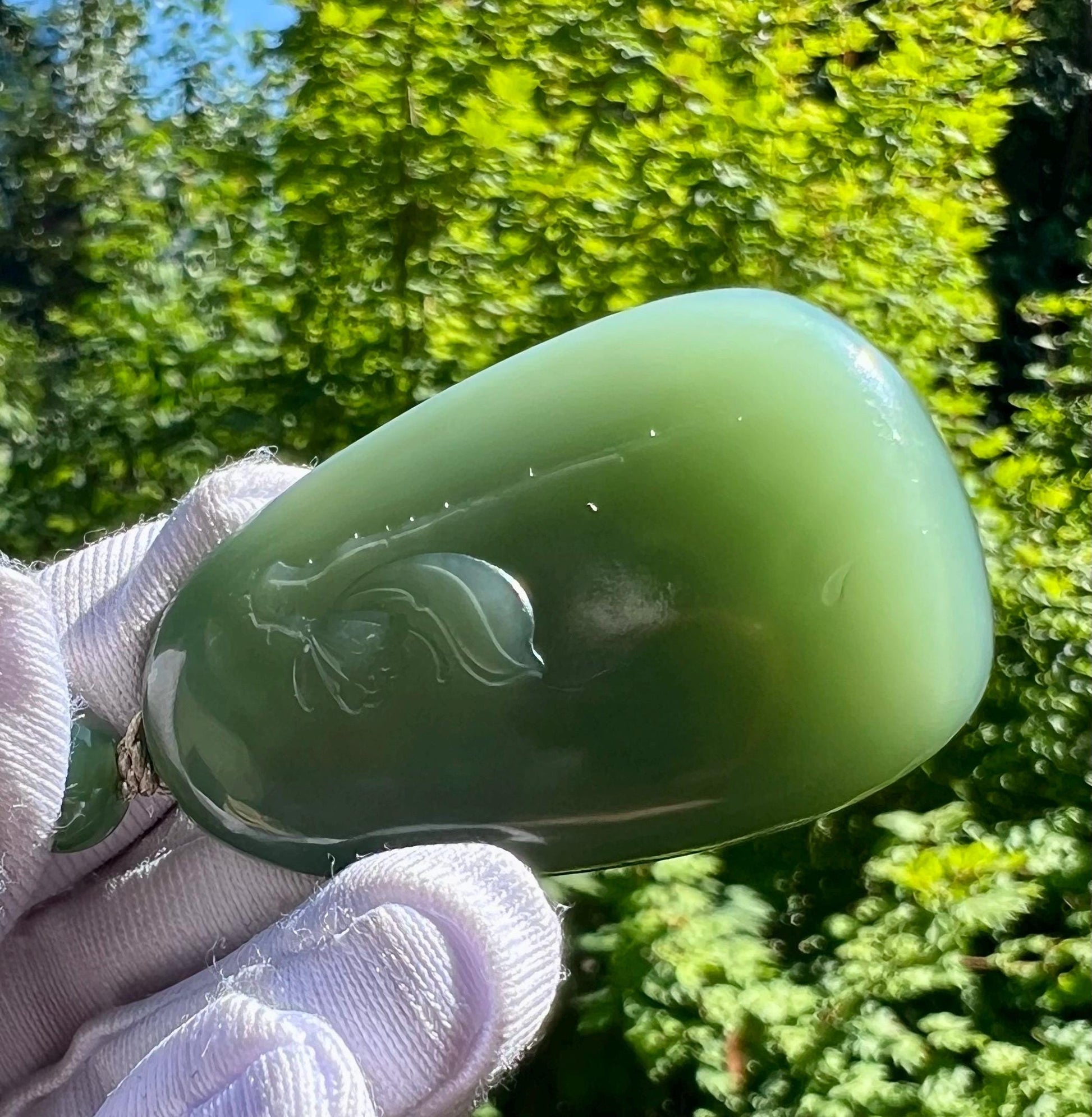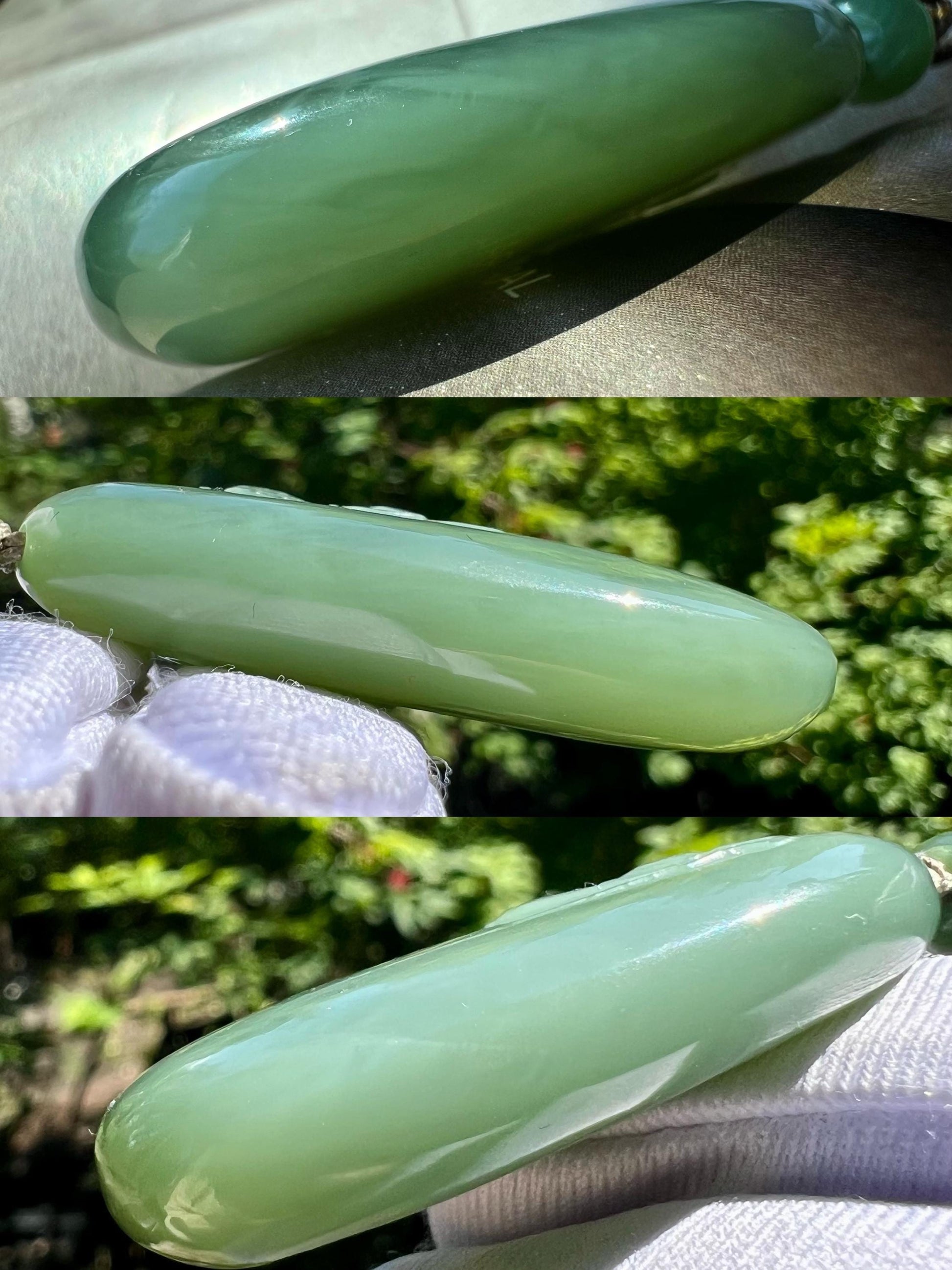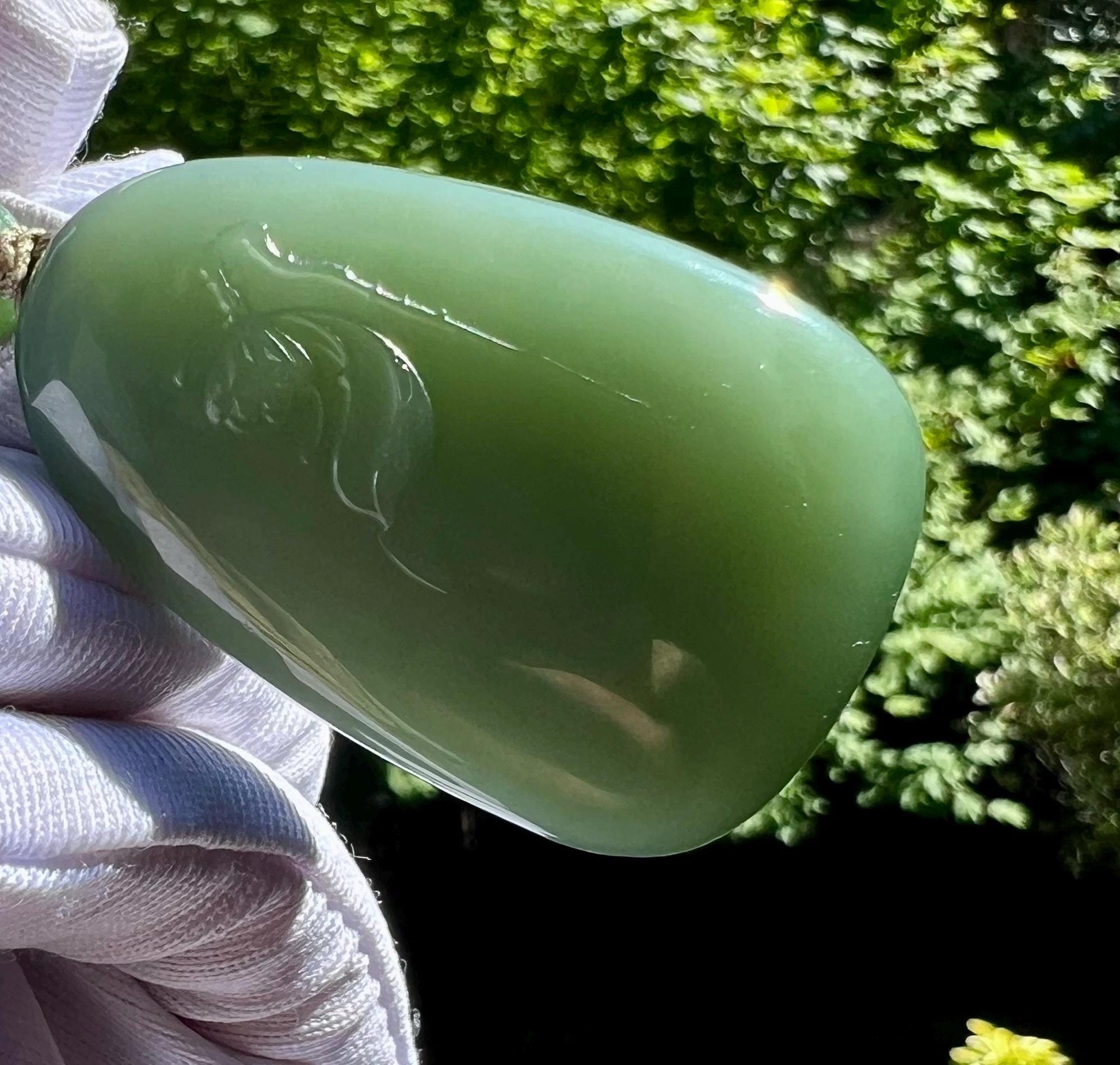 Natural green nephrite , bluish green with fleshy texture. It's oily, glutinous, rich in color, full of luster, no impurities or cracks, with natural nephrite structure.