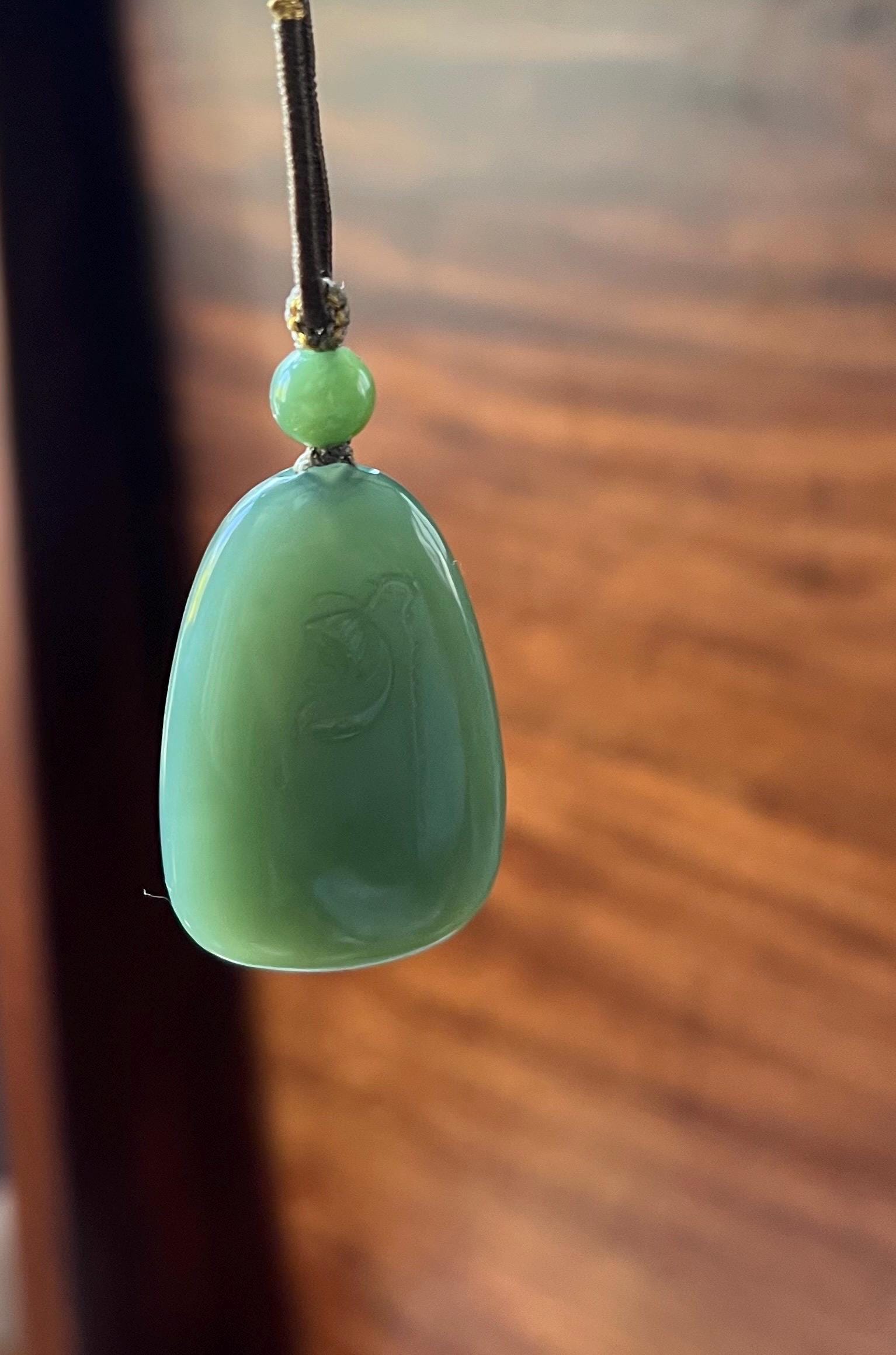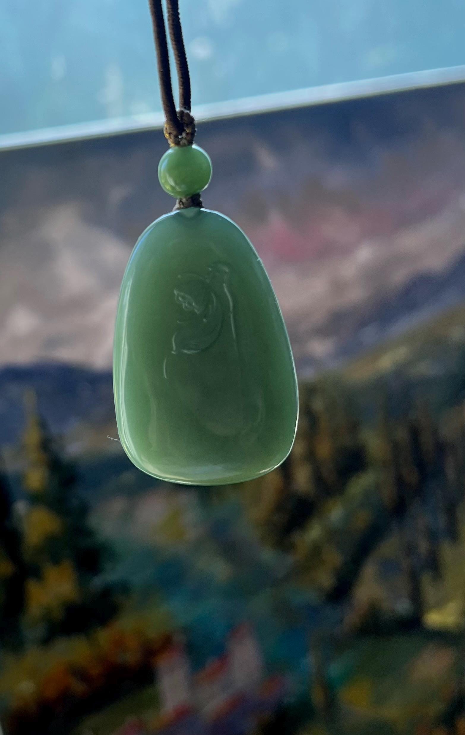 Certified natural nephrite green jade/Siberian green nephrite carved lotus flower pendant/necklace/bluish green 天然软玉 碧玉无事牌 手工雕刻荷花吊坠 肉底粉青起莹光#5098