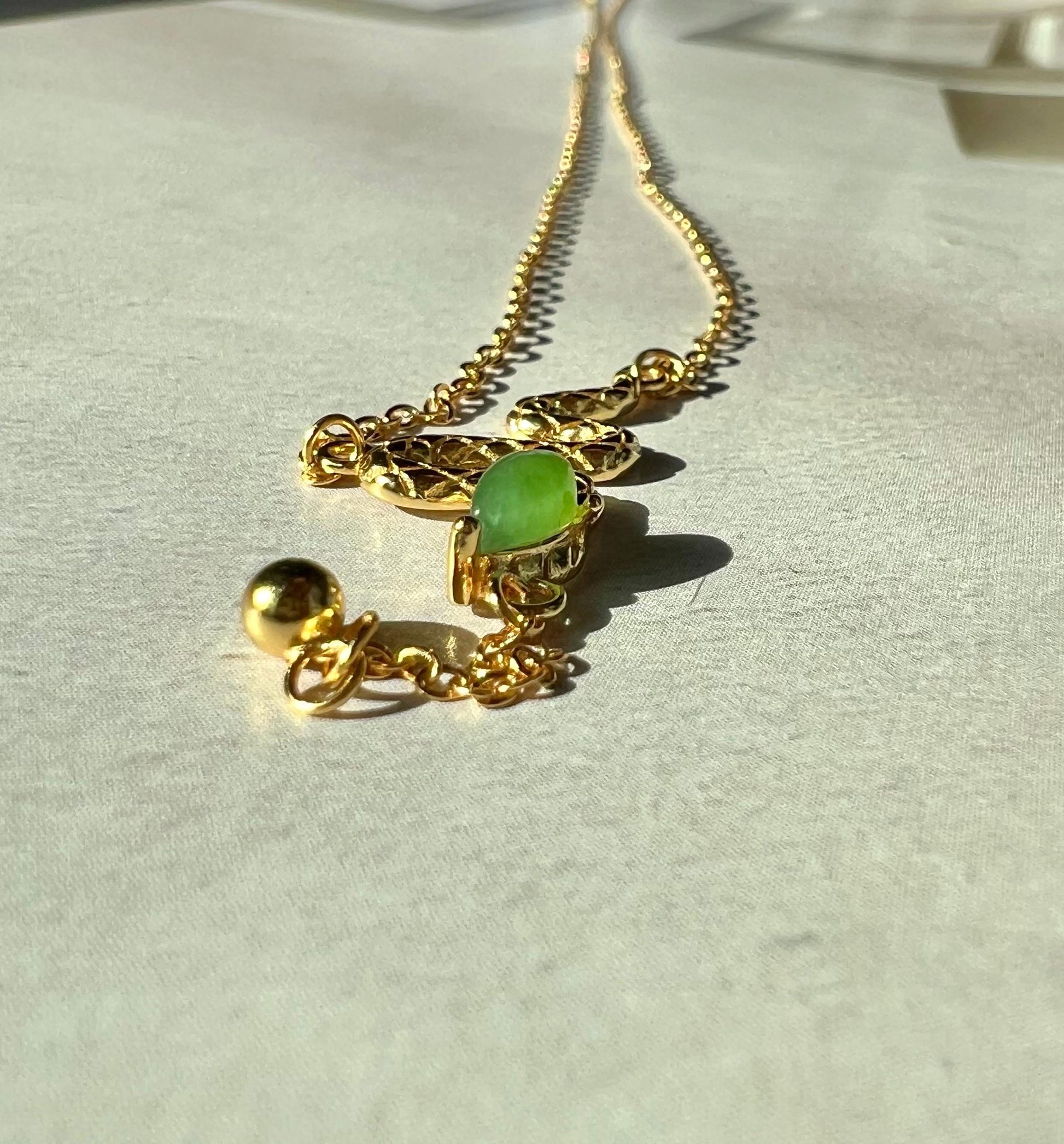 精选碧玉水滴戒面,冰润果阳绿,起冰胶起莹光。纯银镶嵌蛇形项链。