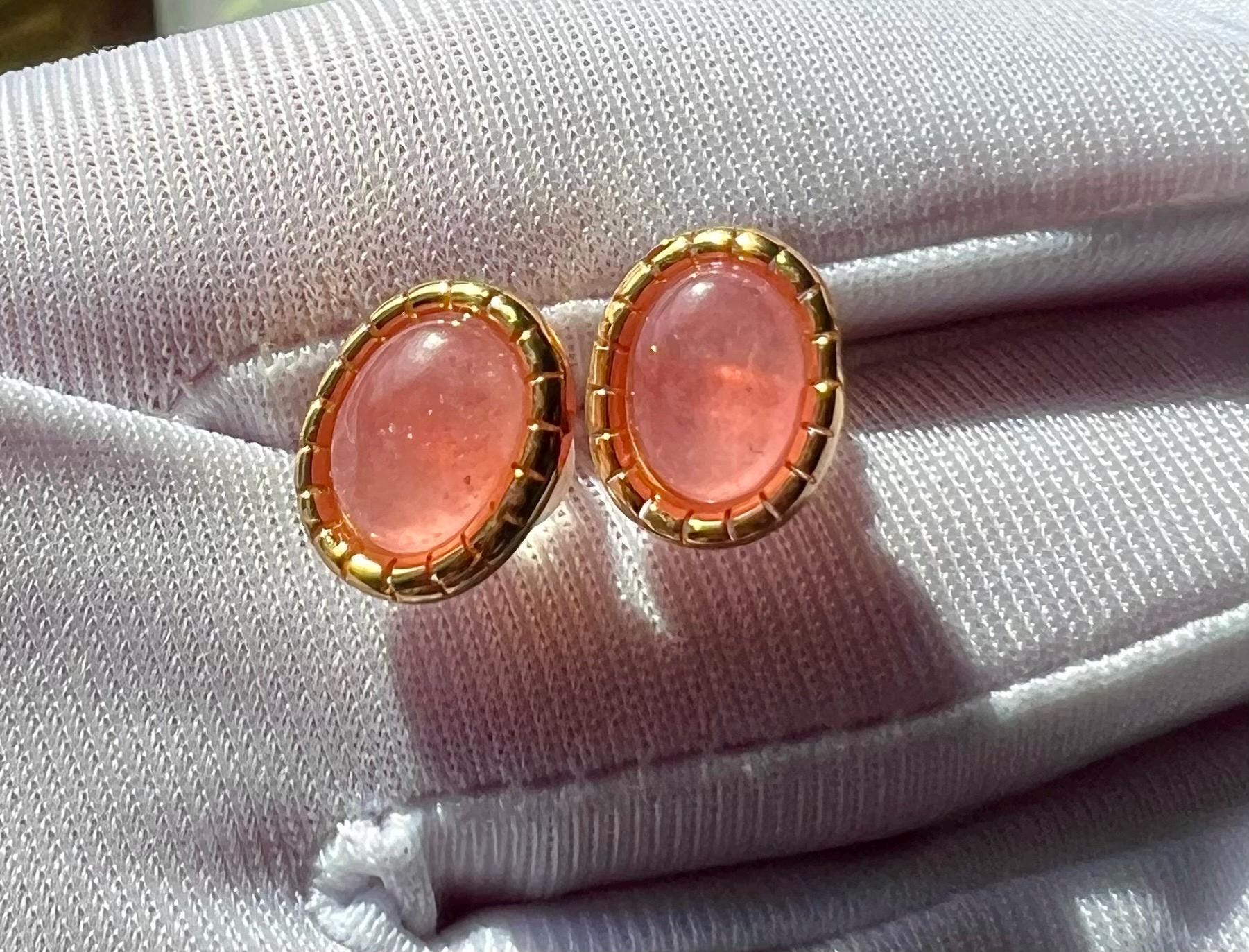 精选天然红纹石蛋面耳钉,冰种润透,嫩粉红色,干净无杂裂。