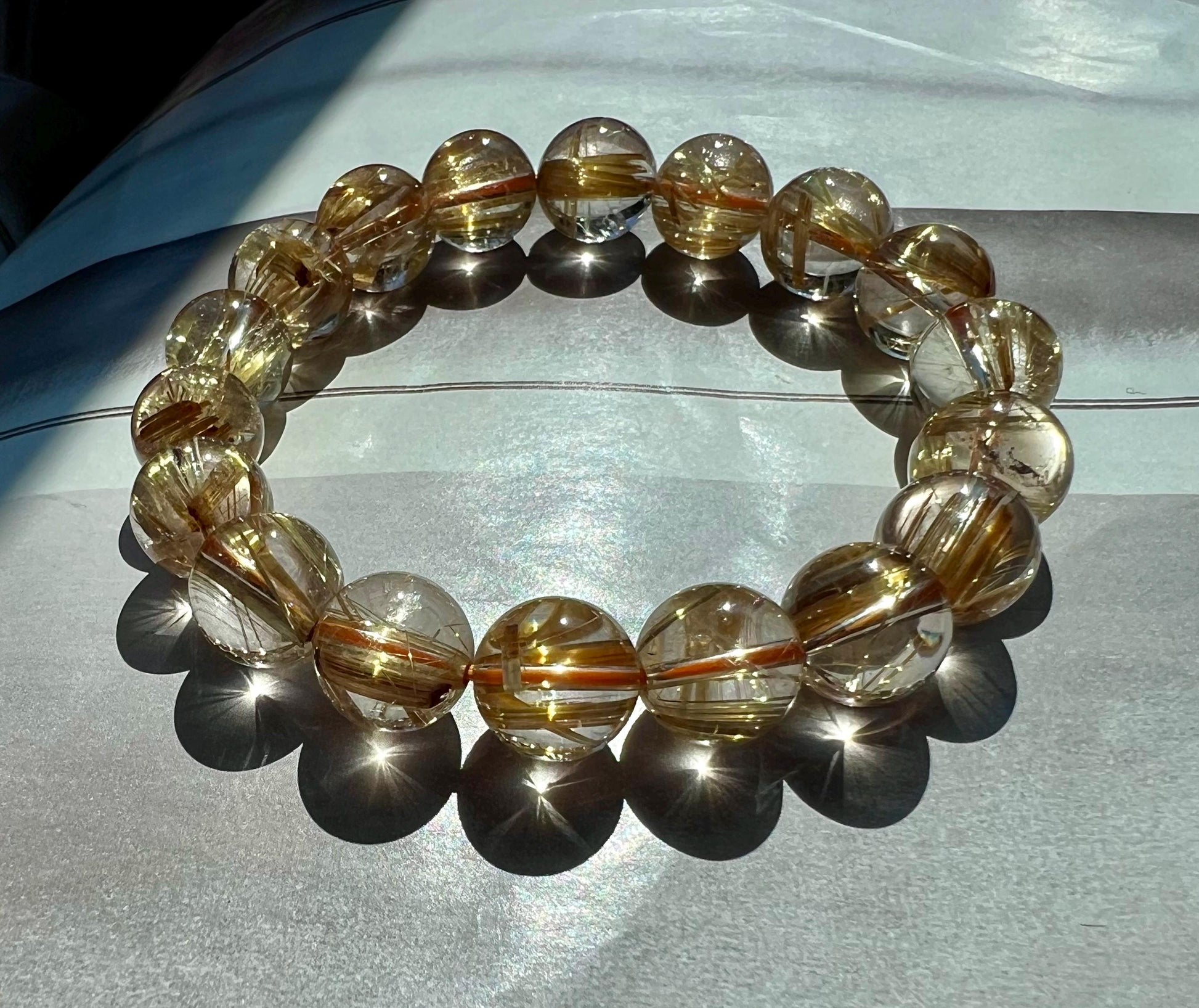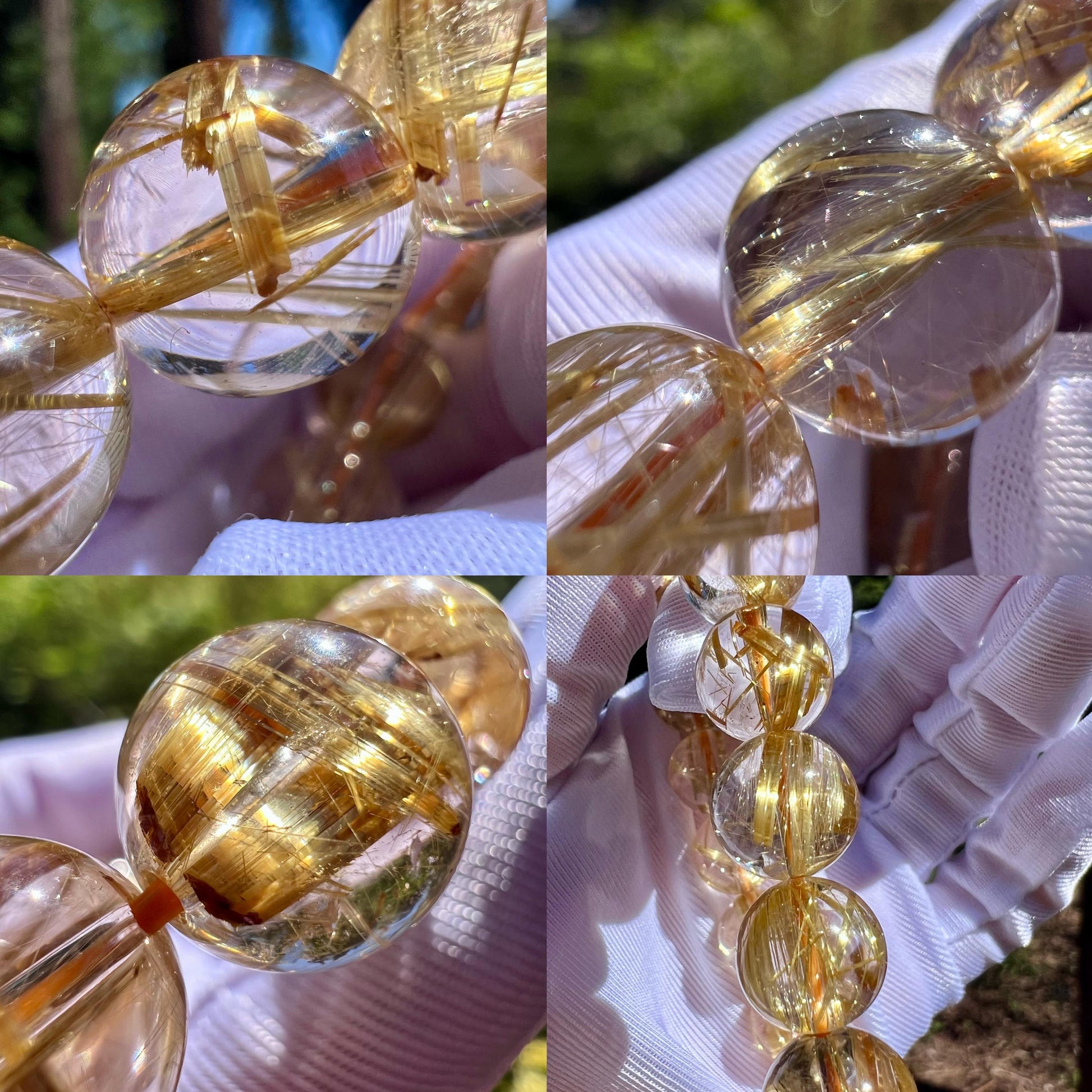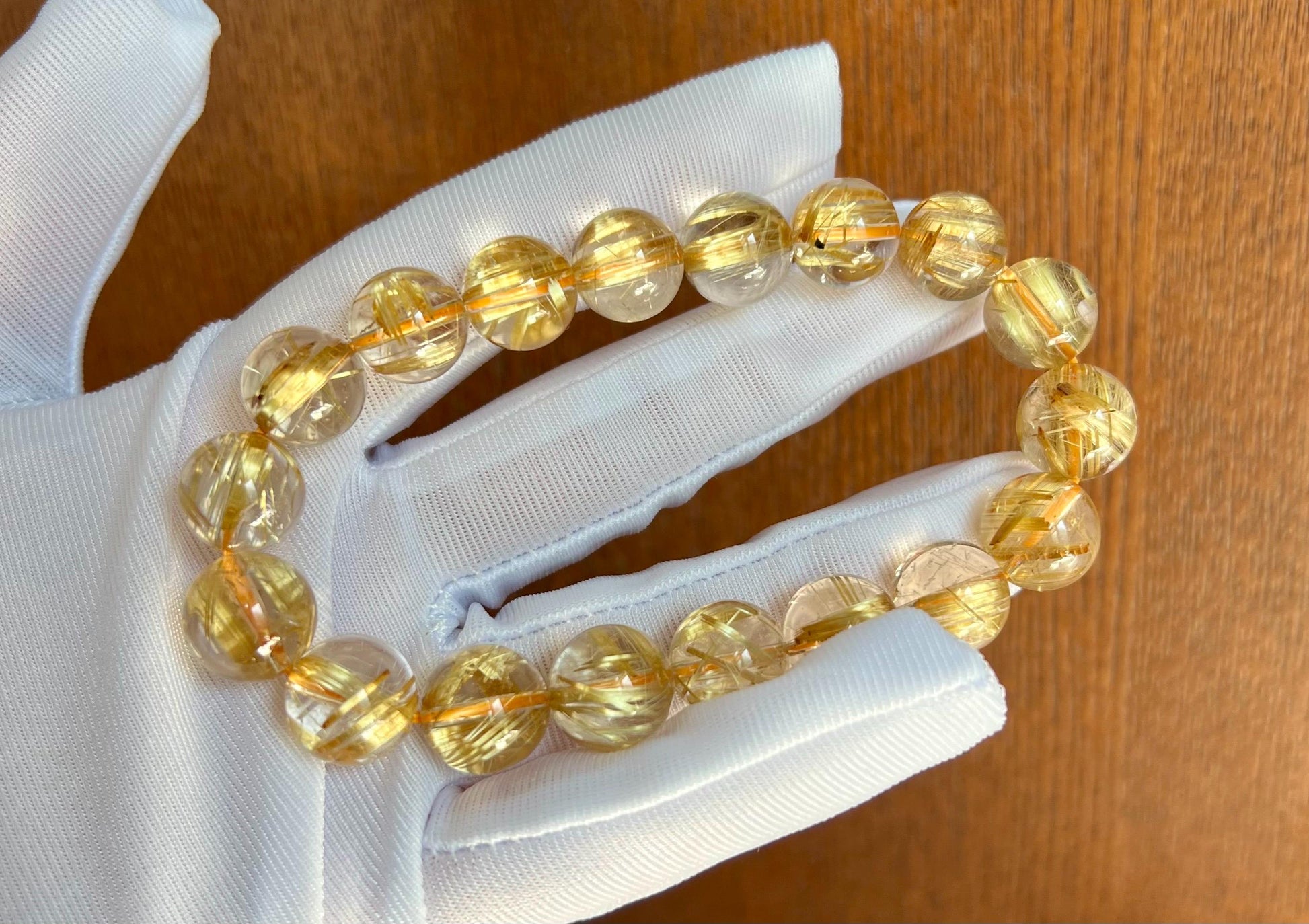High clarity, and the full strands shine like gold. Platy rutile are formed in each bead, and the pieces are like gold. Platy rutile and scattered golden hair rutile complement each other, brilliant like fireworks.