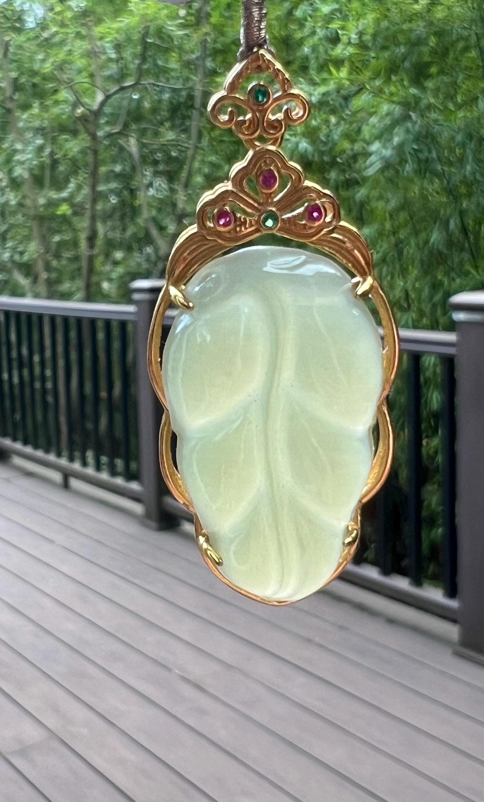 This leaf-shaped pendant is carved from carefully selected natural nephrite jade. This aged material offers a particularly glutinous texture, exceptional fineness, and a lustrous, oily texture.
